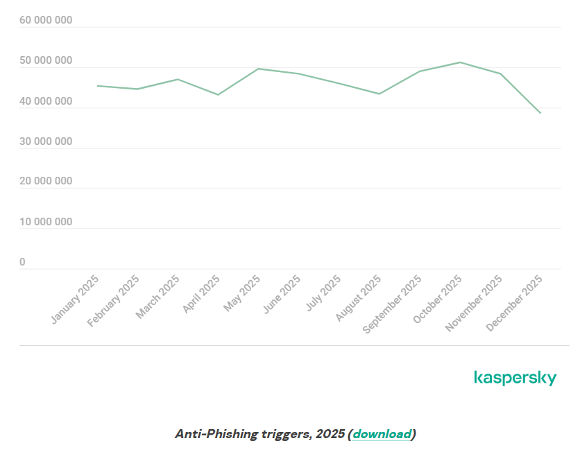 2025年,卡巴斯基解决方案共阻止了554,002,207次试图访问欺诈链接的行为。与前几年的趋势相比,我们并未观察到网络钓鱼活动有任何显著的激增;相反,全年的攻击量保持相对稳定,仅在12月略有下降。