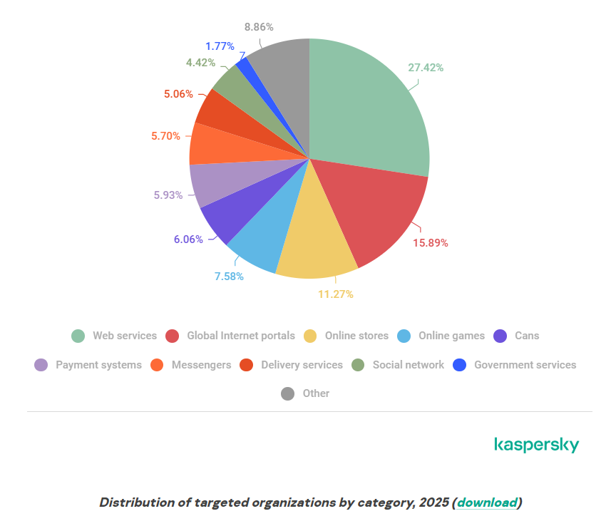仿冒网络服务(27.42%)和全球互联网门户网站(15.89%)的网络钓鱼页面维持了其在十类被攻击目标中的排名,继续分别占据第一和第二位。在线商店(11.27%),这一威胁行为者的传统偏好,重返第三位。2025年,钓鱼者对在线游戏玩家的兴趣增加:仿冒游戏平台的网站从第九位跃升至第五位(7.58%)。紧随其后的是银行(6.06%)、支付系统(5.93%)、即时通讯工具(5.70%)和快递服务(5.06%)。网络钓鱼攻击还针对社交媒体(4.42%)和政府服务(1.77%)账户。