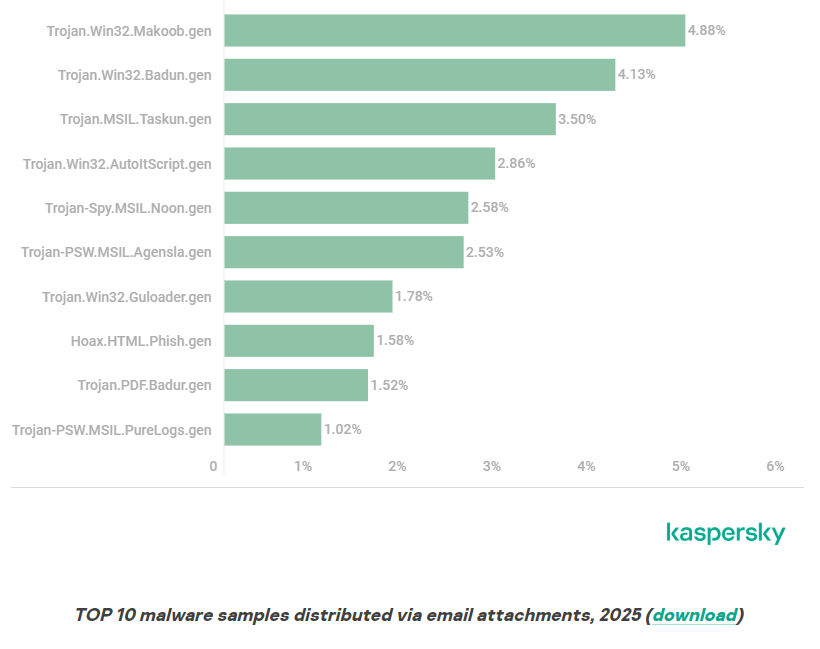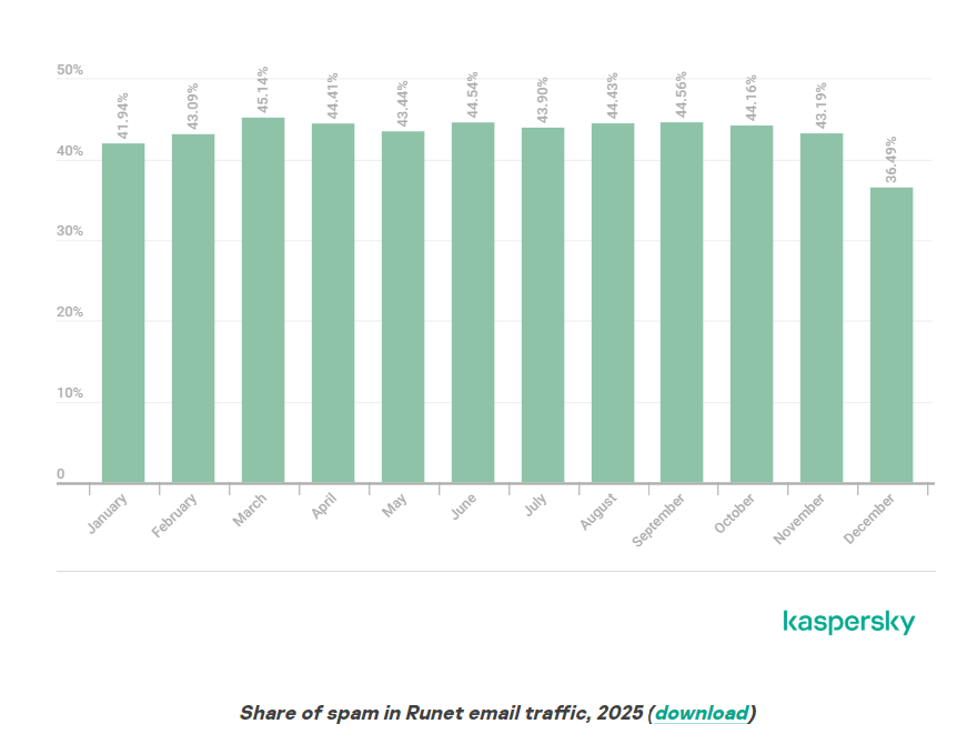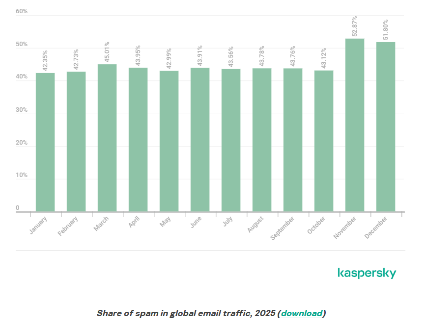 2025年,垃圾邮件在全球电子邮件流量中的平均占比为44.99%,较上一年下降2.28个百分点。值得注意的是,与过去几年的趋势相反,第四季度是最为繁忙的季度:平均有49.26%的电子邮件被归类为垃圾邮件,活动高峰出现在11月(52.87%)和12月(51.80%)。在今年其余时间里,垃圾邮件的分布相对稳定,无显著激增,平均占比维持在约43.50%。