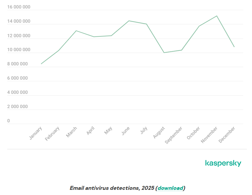 2025年,卡巴斯基解决方案共拦截了144,722,674个恶意电子邮件附件,相较前一年增加了一千九百万。年初和年末传统上是最稳定的时期;然而,我们也观察到八月和九月活动显著下降。电子邮件反病毒检测的高峰出现在六月、七月和十一月。