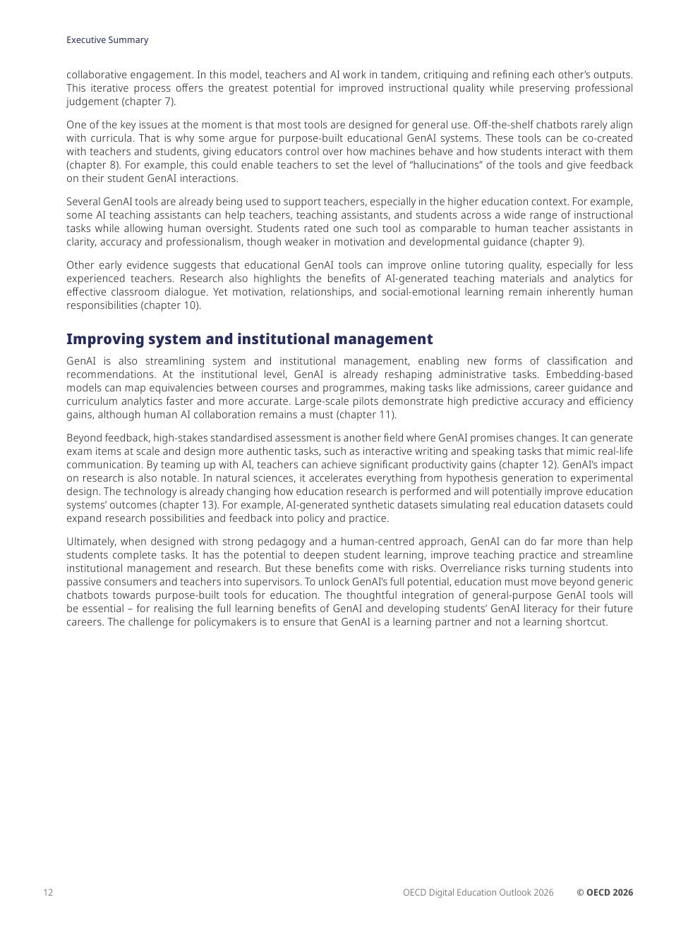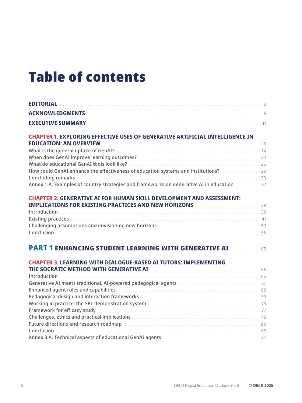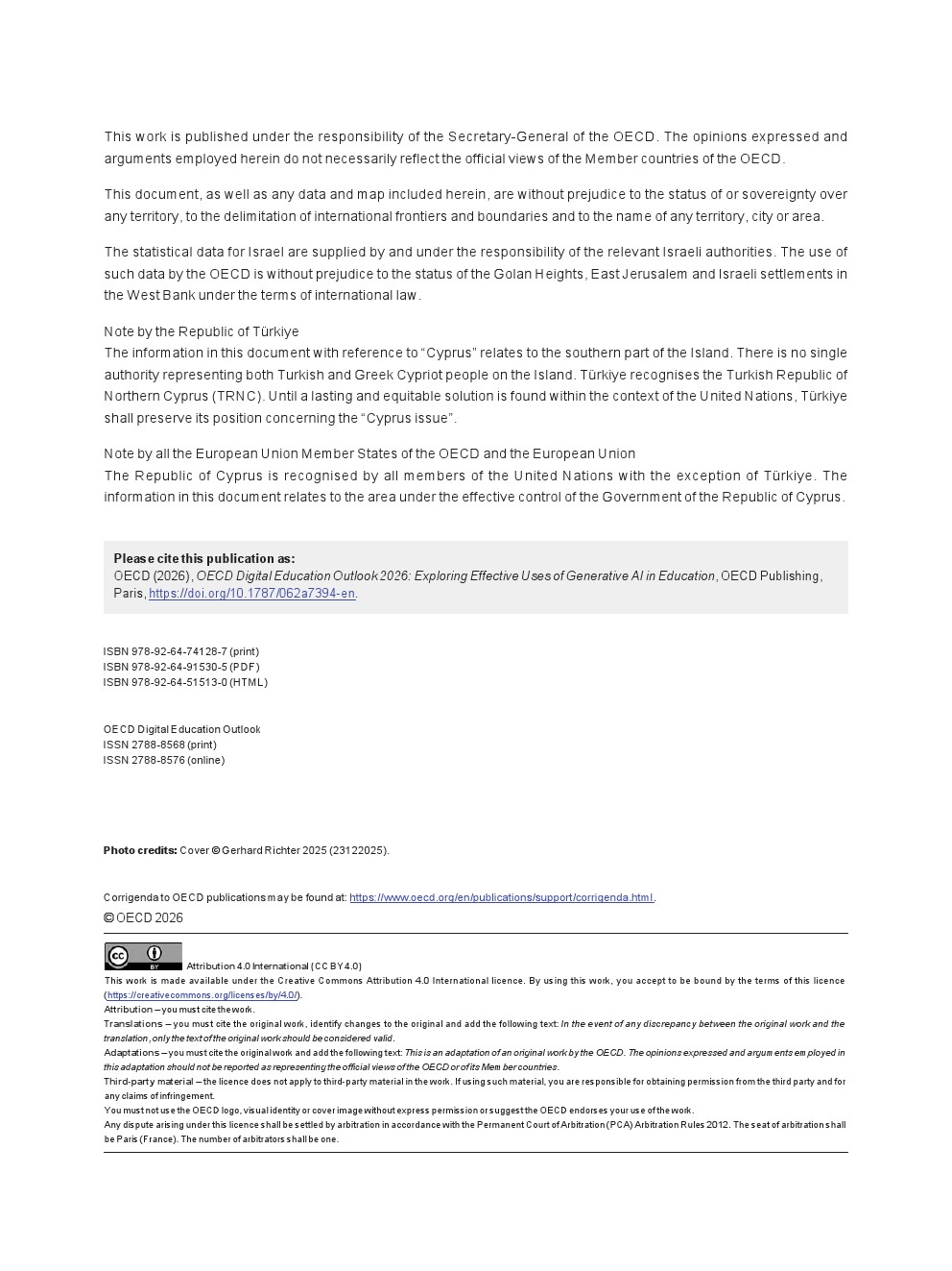 OECD发布了新报告“2026年数字教育展望”。生成式人工智能(GenAI)正迅速进入世界各地的教育系统,引发了对更加个性化的学习、增强的教学实践以及更高效的系统管理的期望。报告借鉴了最佳可用实证研究、设计实验和专家见解,探讨了生成式人工智能在哪些方面展现出前景,以及教育利益相关者如何引导其有效且负责任地采用。