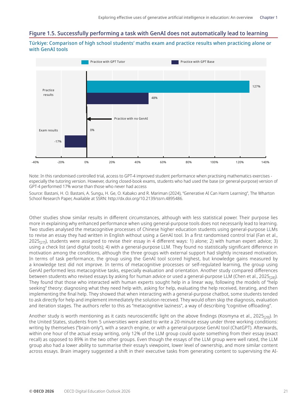 有证据表明,生成式人工智能可以规模化提供个性化学习支持,提高反馈质量,并实现评估环节的部分自动化。但这种便利可能是有代价的。当学生过度依赖生成式人工智能时,元认知参与度——即把答案转化为理解的心理过程和努力——就会下降。这导致任务表现与真实学习之间出现错位。