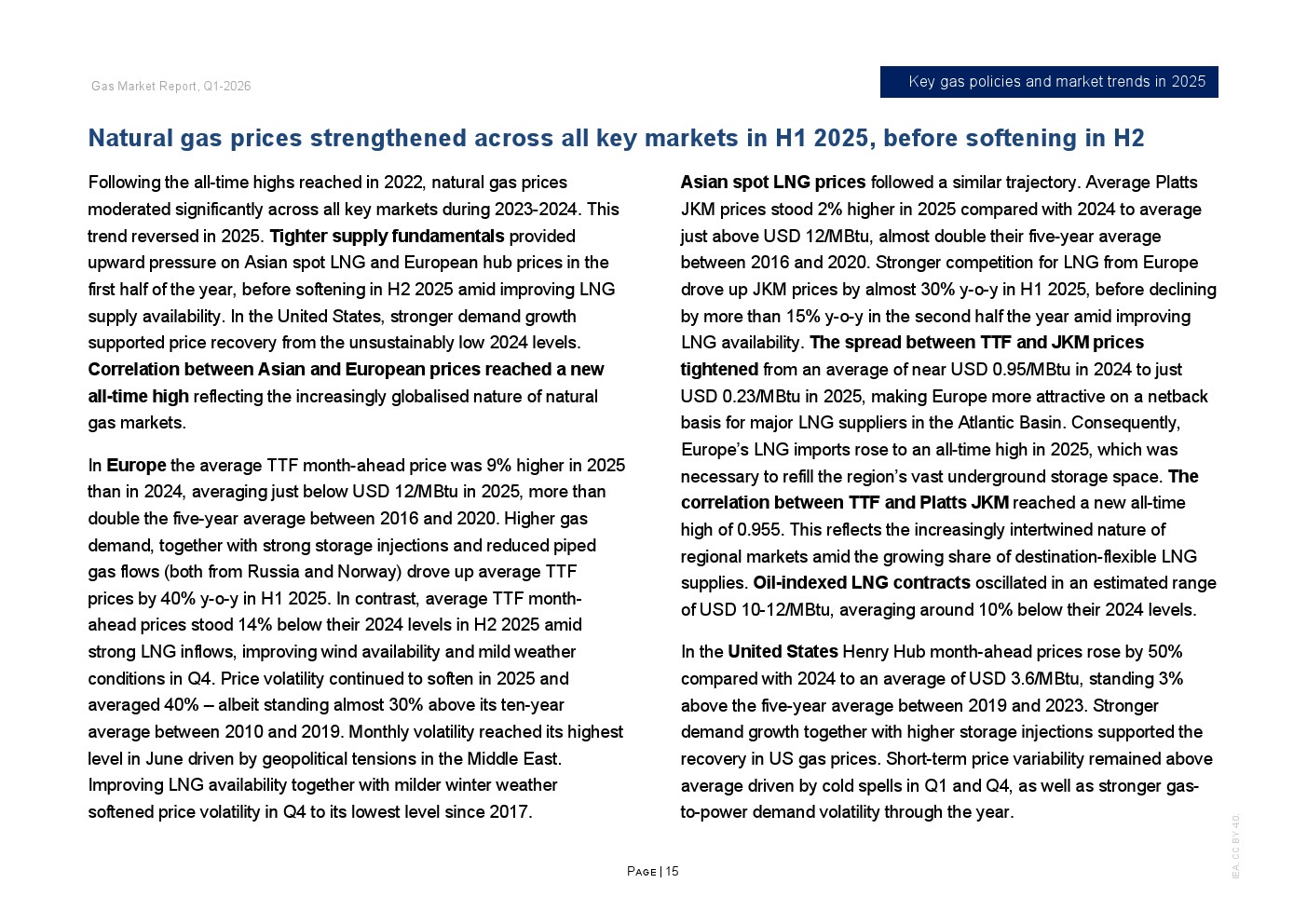 价格体系联动性明显增强。2025年TTF与JKM月度价格相关系数升至0.955,创历史新高,区域市场高度一体化。欧洲全年TTF均价接近12美元/百万英热单位,同比上涨9%;JKM均价亦在12美元上方,同比上涨2%。两地价差从2024年的0.95美元缩窄至0.23美元,跨区域套利空间收敛,现货流向更趋灵活。美国Henry Hub价格同比上涨50%至3.6美元,回归五年均值上方。
