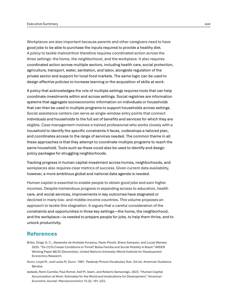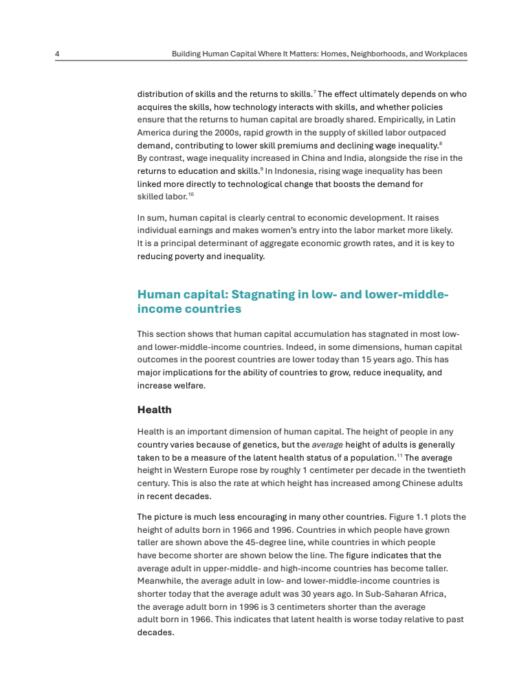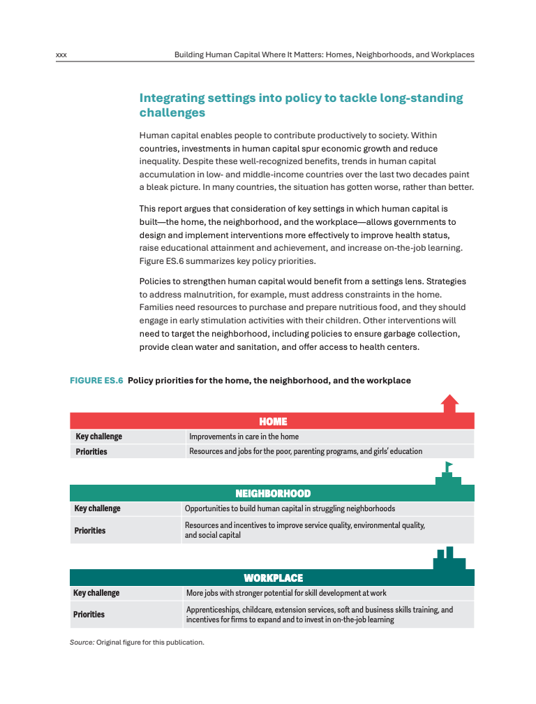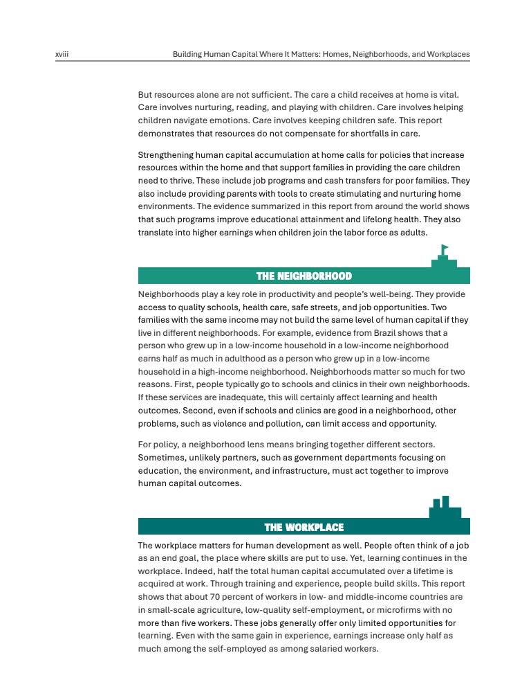 社区环境同样决定长期回报。在巴西,成长于低收入家庭但居住在高收入社区的个体,其成年收入是成长于低收入社区者的两倍。社区学校质量处于最高十分位的儿童,其年学习进步比最低十分位高出44%。环境因素亦具关键性,印尼在无露天排便社区成长的儿童,发育迟缓概率低10个百分点以上 。