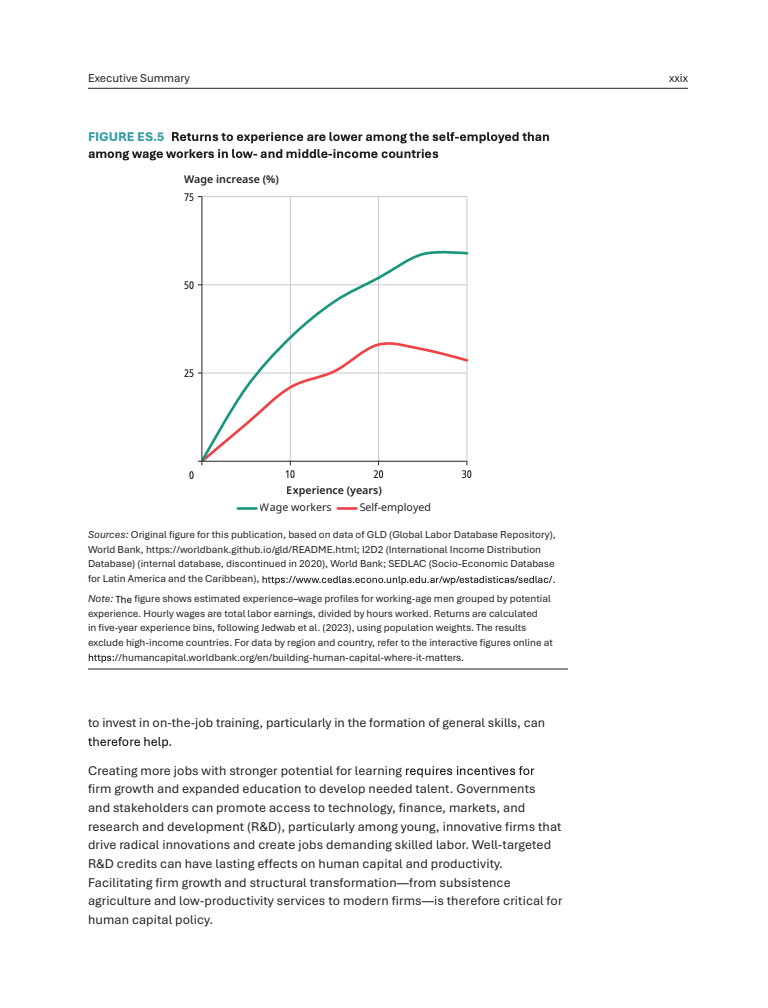 从收入结构看,人力资本差异解释了富国与穷国人均GDP差距的约三分之二。个体层面,每增加一年受教育年限,收入平均提高约10%,每增加一年工作经验,收入提升约2.5%。然而,在低收入国家,自雇者的经验回报仅为受薪员工的一半,约70%的劳动者集中在小规模农业或微型企业,学习机会有限 。
