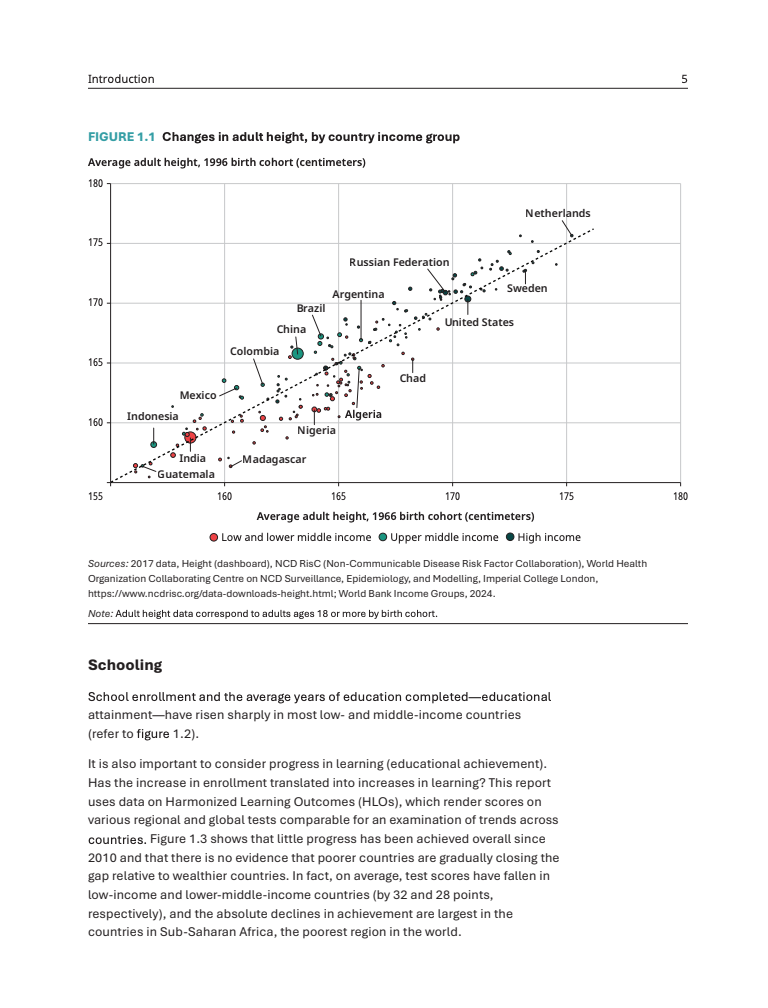 报告数据显示,约三分之二的中低收入国家在健康、学习或工作技能发展方面出现倒退。撒哈拉以南非洲1996年出生人口的成年平均身高较1966年出生人口低3厘米,显示潜在健康状况恶化。教育方面,2010至2025年间,低收入和中低收入国家的HLO测试成绩平均分别下降32分和28分,学习质量明显停滞 。