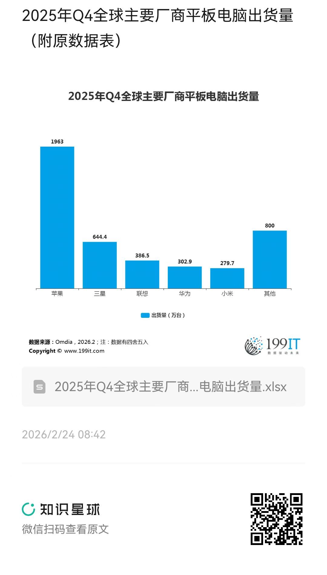- 2025年Q4全球主要厂商平板电脑出货量同比(附原数据表)