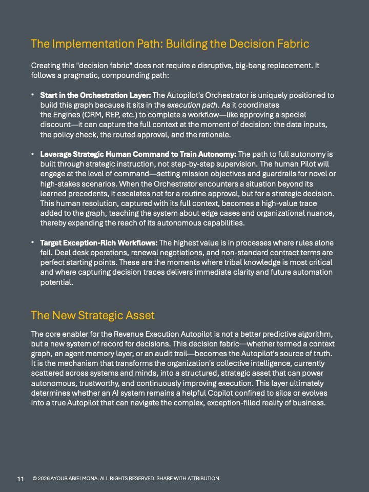 为支撑这一转变,报告提出以“决策织体”为核心的新型数据资产。传统系统记录结果,却缺乏对决策过程、例外处理与批准逻辑的结构化沉淀。而自主系统的前提,正是将这些隐性经验转化为可追溯、可学习的上下文图谱,从而实现规模化自治与可审计性。