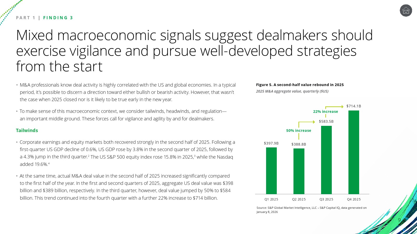 宏观经济信号呈现典型的“顺风与逆风并存”。美国GDP在2025年第一季度收缩0.6%后,第二季度与第三季度分别反弹至3.8%和4.3%。股市表现强劲,标普500全年上涨15.8%,纳斯达克上涨19.6%。并购市场价值亦在下半年明显反弹,季度交易额从上半年的约3900亿美元升至第四季度的7141亿美元。