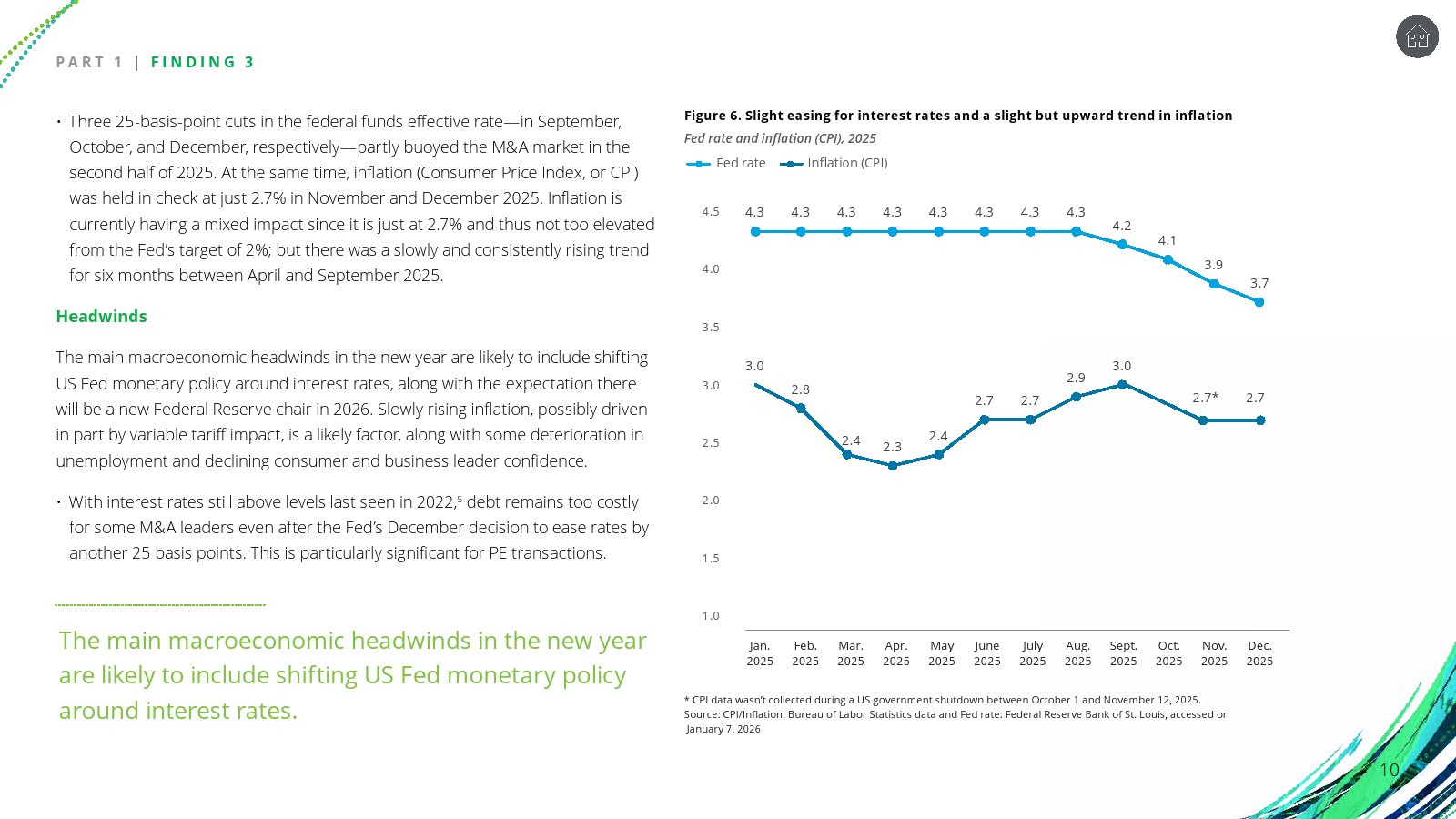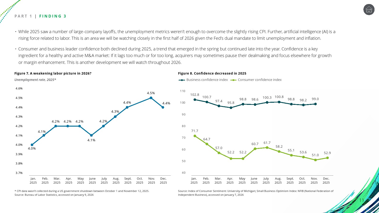 然而金融环境仍对交易活动形成约束。尽管2025年下半年美联储三次降息,每次25个基点,但融资成本仍明显高于2022年水平。通胀在年末维持在约2.7%,失业率从4.0%逐步升至4.5%,同时企业与消费者信心指数持续下降。这些因素使得企业在并购决策上更加谨慎。