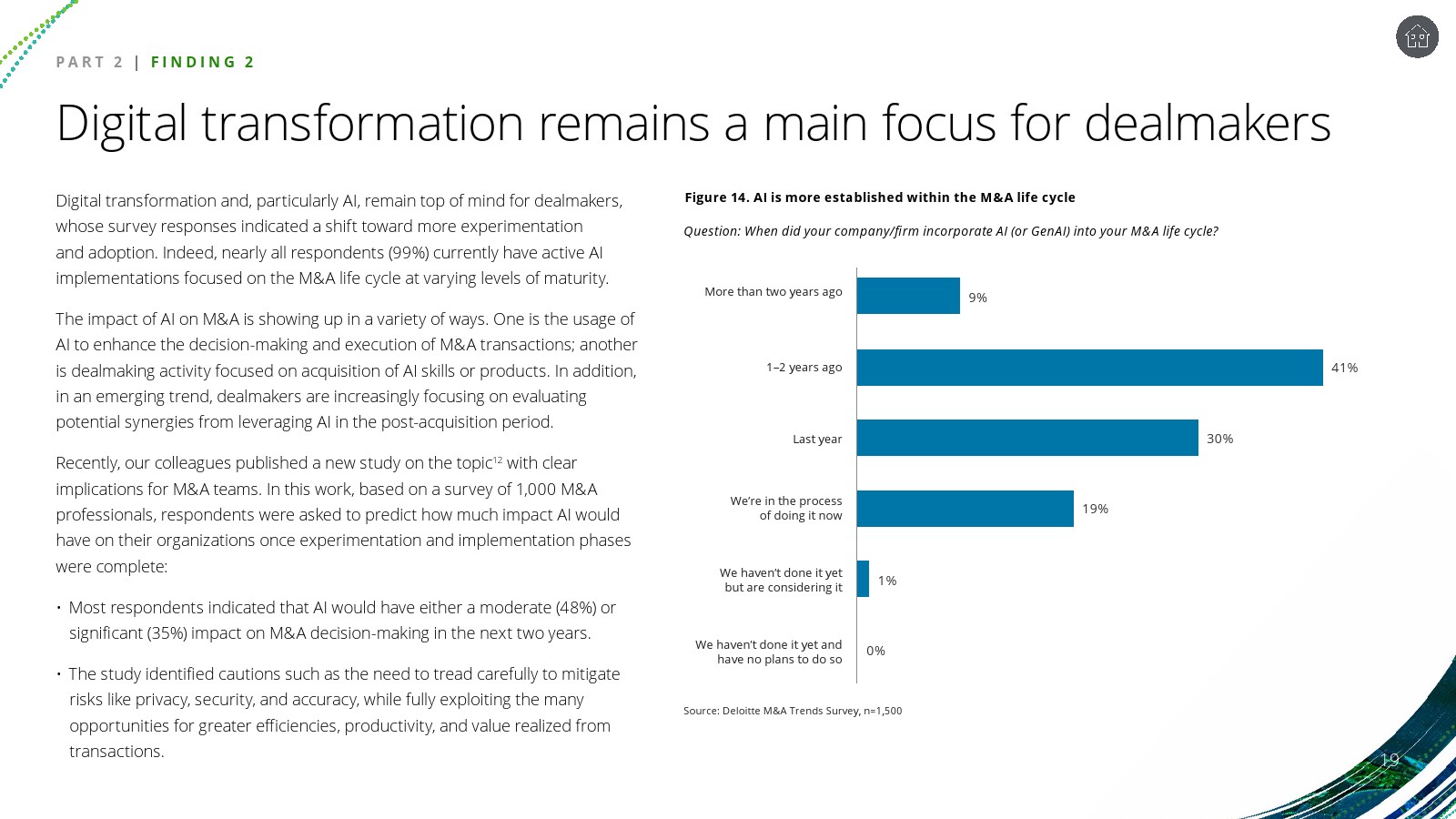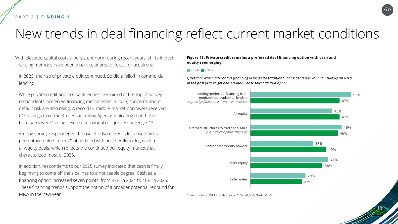交易模式与技术应用亦在快速演化。私募信贷仍是主要融资渠道之一,但全股权交易和现金融资的比例上升,现金融资使用率从33%升至40%。与此同时,99%的受访机构已在并购生命周期中引入AI工具,其中48%的受访者预计未来两年AI将对并购决策产生中等影响,35%认为影响将显著。