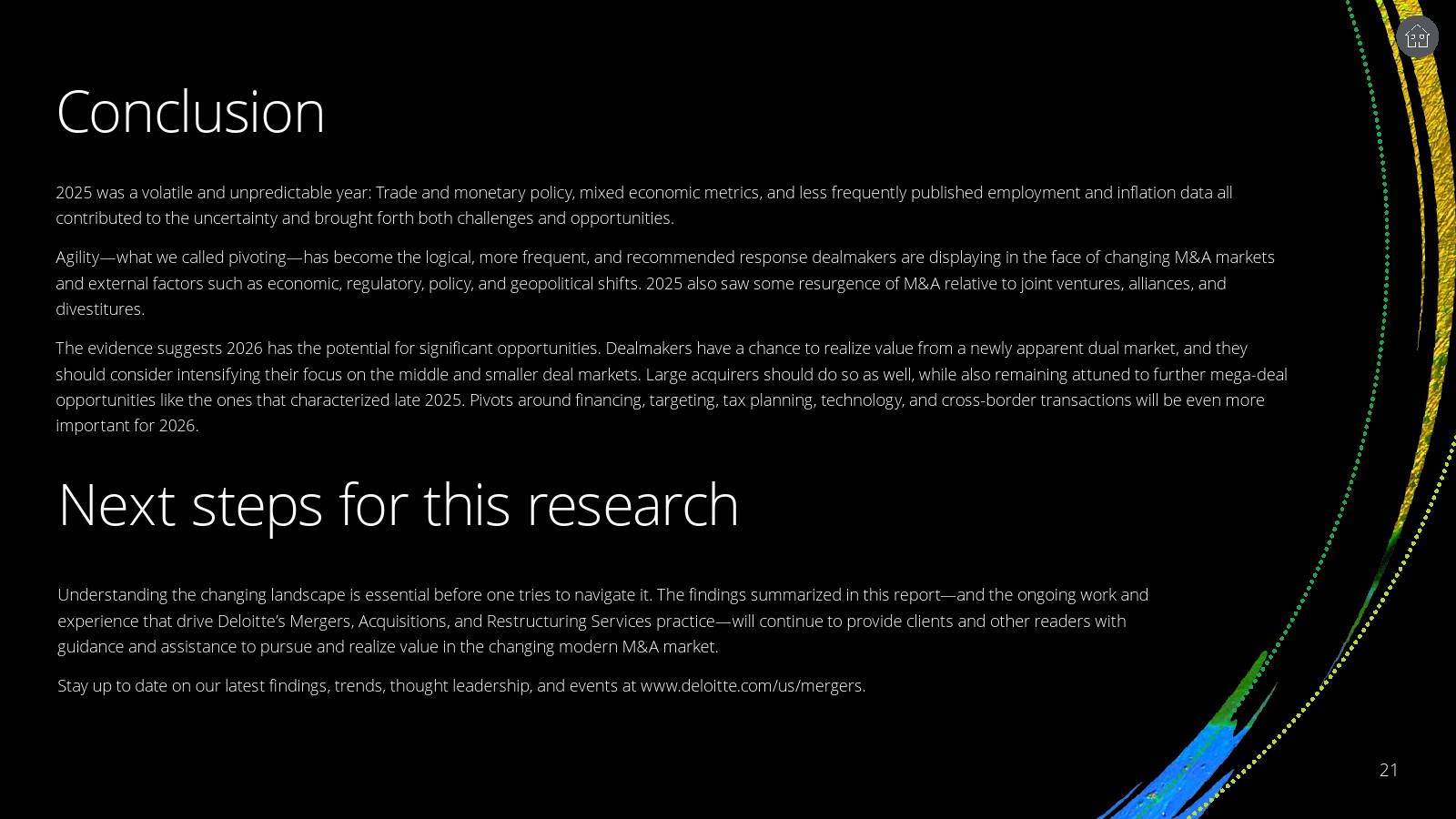 整体来看,2026年的并购市场将呈现更强的结构分化与策略灵活性。一方面,巨型交易仍可能在科技和产业整合驱动下出现;另一方面,中型和中小交易将成为更稳定的增长来源。在利率、地缘政治与技术革命交织的环境下,具备快速调整能力、融资结构创新能力以及技术整合能力的企业,将更可能在新一轮并购周期中获得超额价值。