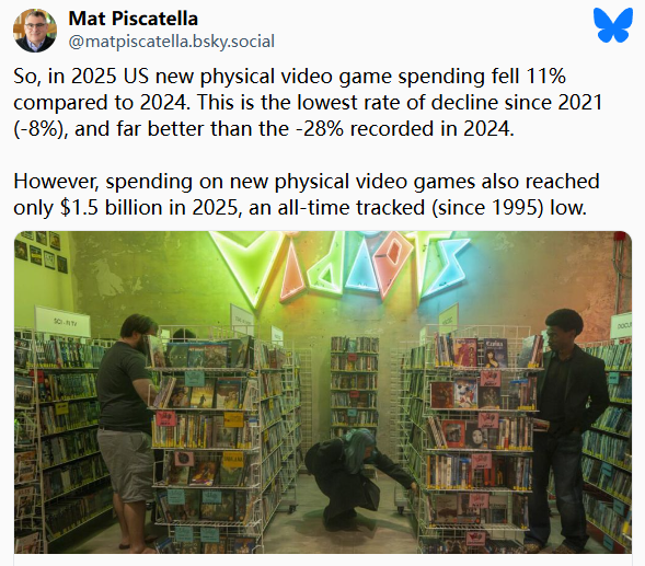 这一趋势是全球性的。去年一份关于英国实体市场的报告,描绘的画面同样惨淡。如果非要在这份最新的数据中找出一线希望,那就是下滑幅度并没有想象中那么陡峭。Mat Piscatella指出,2025年实体游戏支出下降了11%——这是自2021年以来的最小跌幅,相比2024年高达28% 的同比下滑,已算是显著改善。