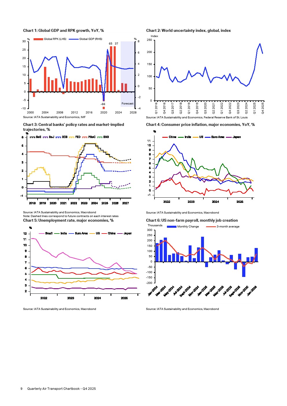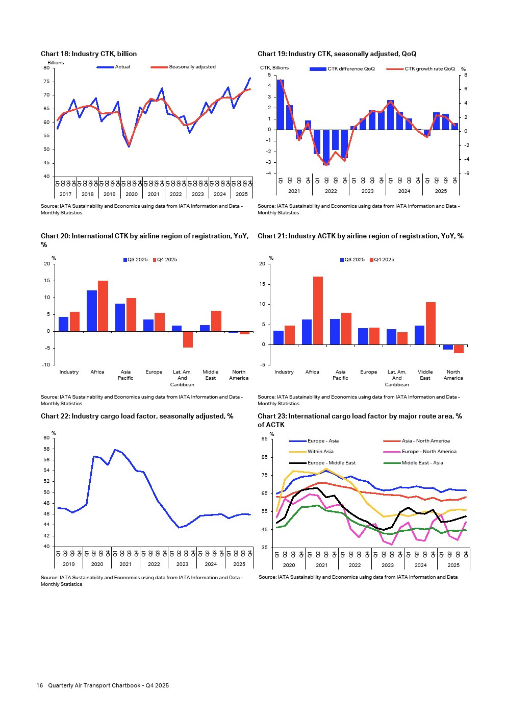 2025年第四季度,全球航空货运需求展现强劲势头,同比增长4.6%,达到764亿货运吨公里,创下年内最高季度增长率,并为行业再添创纪录运量。经季节性调整的货运吨公里数据反映了本季度的增长,同比增长4.5%,相当于环比增长0.9%,使全球航空货运量较上一季度增加6亿货运吨公里。
