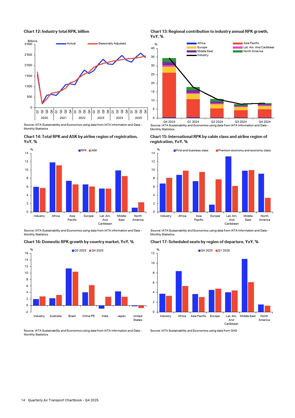 2025年第四季度,全行业客运量达到2.4万亿收入客公里,同比增长6.0%。经季节性调整后,收入客公里环比增长2.5%,创下2025年最高季度增长率。以可用座位公里衡量的全行业运力同比增长5.7%,但增速低于客运量,导致客座率上升0.2个百分点至84.0%。