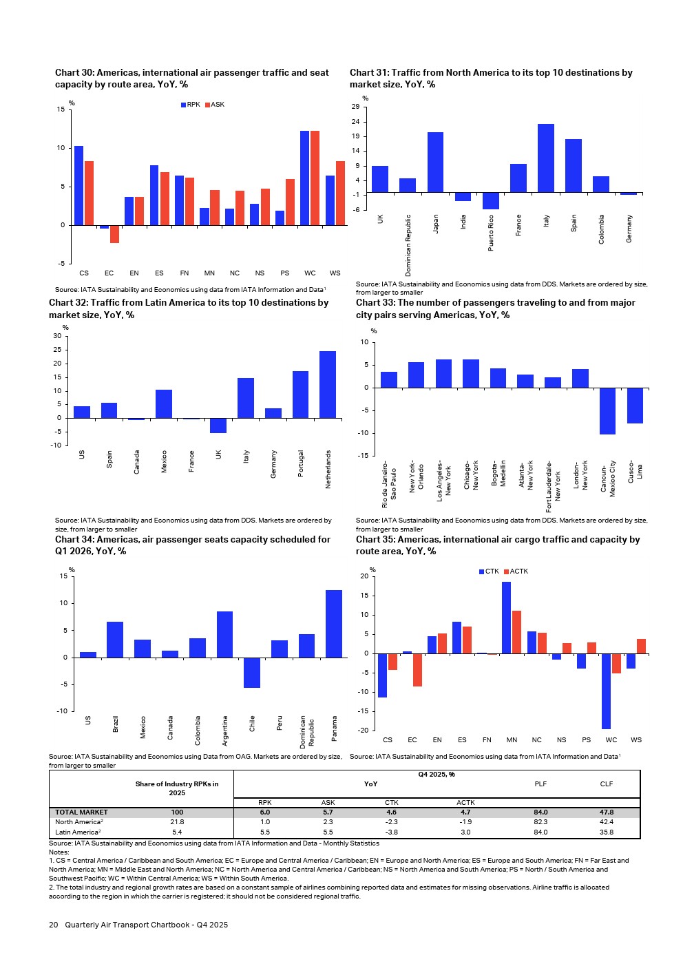 2025年第四季度,拉丁美洲和加勒比地区航空公司的客运量增长率低于全球行业平均水平,为该年度首次。客运量同比增长5.5%,低于6.0%的全球平均水平,而该区域座位运力增长率与区域收入客公里扩张速度持平,同比增长5.5%。因此,客座率稳定在84.0%,与全球平均水平持平。北美航空公司第四季度表现依然低迷。需求仅同比增长1.0%,而座位运力温和增长2.3%,导致客座率下降至82.3%,低于行业平均水平1.7个百分点。