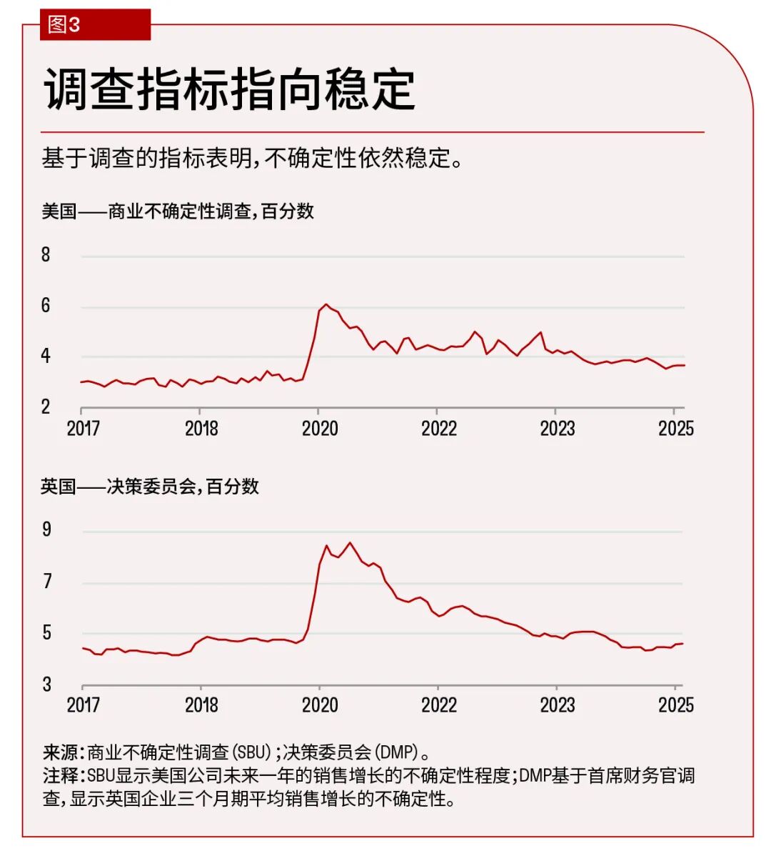 该指标显示在疫情期间不确定性大幅上升,2020年1月至5月大约翻了一倍,随后缓慢回落(图3)。截至2025年6月,并未出现不确定性激增的情况。一种解释是,企业可能没有关注经济或政治新闻。然而,SBU委员会确实在2024年11月唐纳德·特朗普(Donald Trump)当选总统后,大幅上调了销售增长预测,并在2025年春季关税战开始后下调了预测。