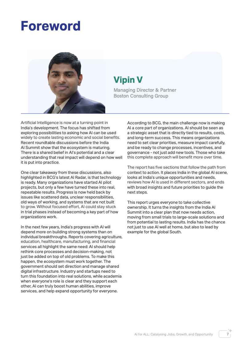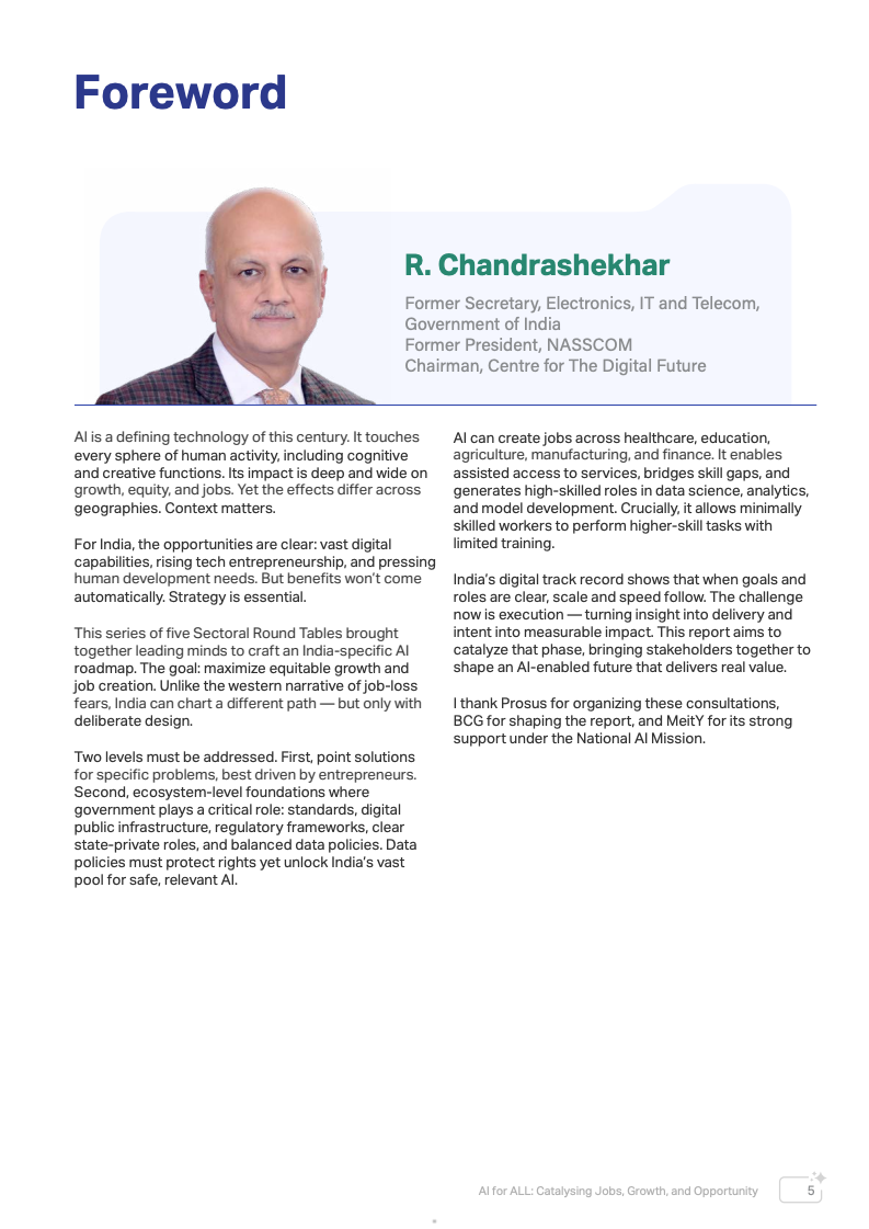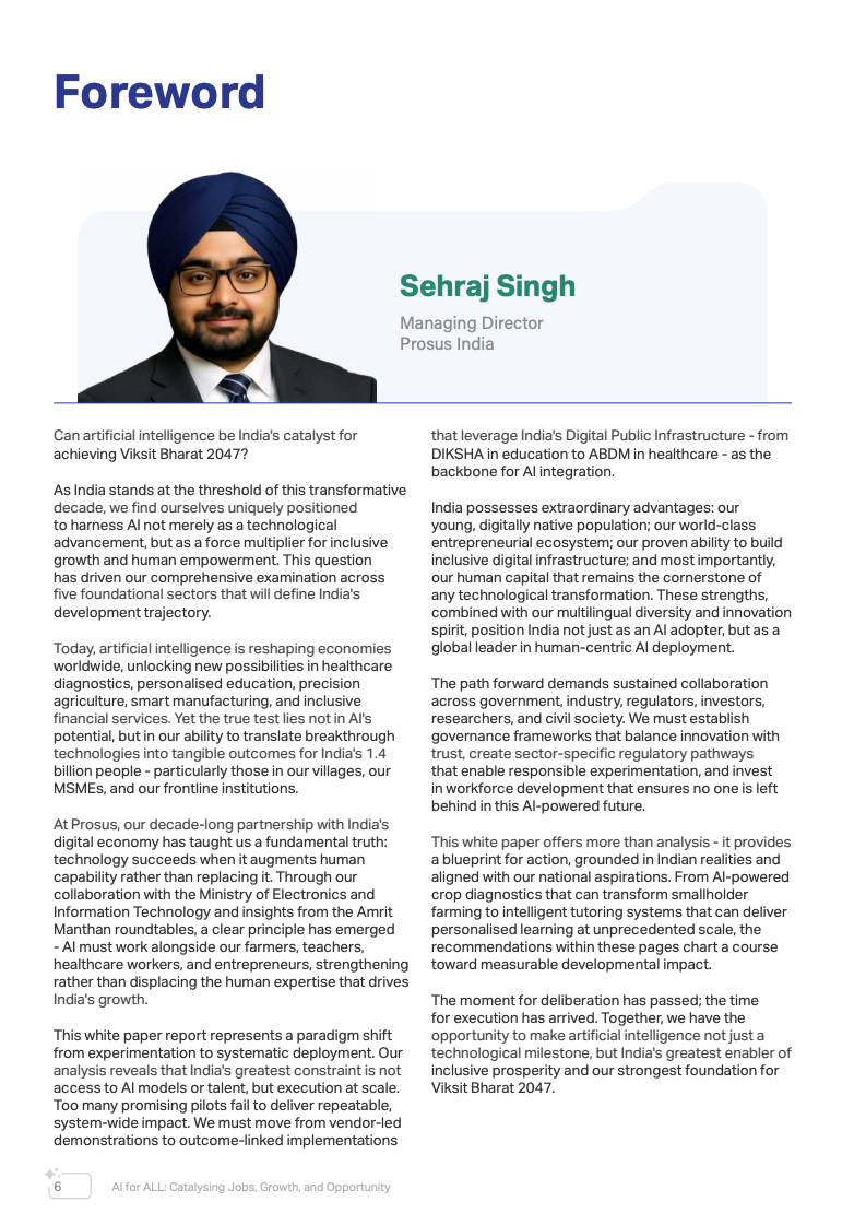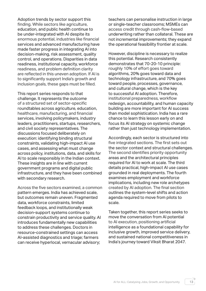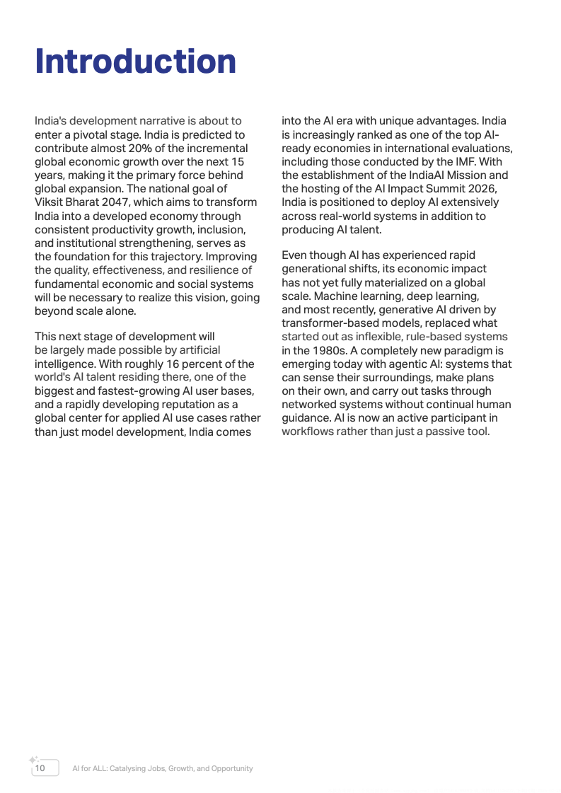 全球经济正进入以人工智能为核心驱动力的新阶段。报告指出,未来15年印度预计将贡献接近20%的全球新增经济增长,人工智能正成为推动这一增长的关键基础设施。不同于以往仅提升效率的数字化浪潮,AI正在深入决策流程、资源配置和生产系统,对生产率、公共服务效率以及长期国家竞争力产生结构性影响。