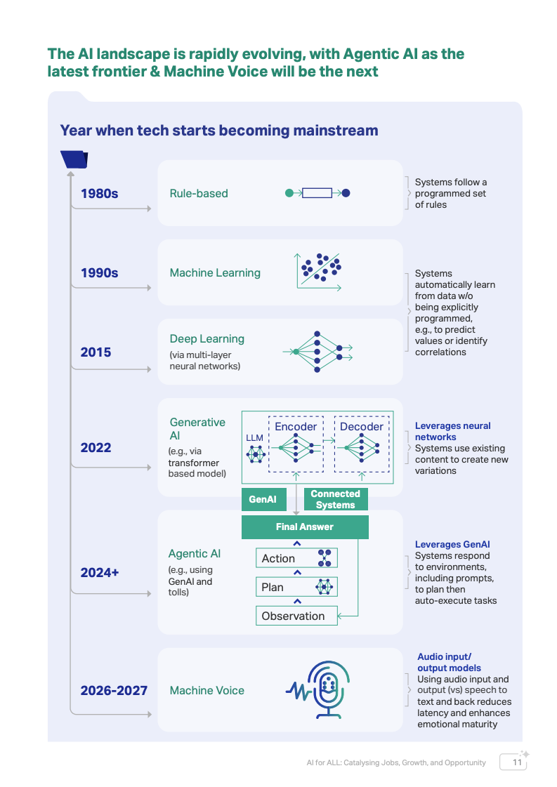 从技术演进来看,人工智能已经经历多次范式跃迁。从20世纪80年代的规则系统,到90年代机器学习,再到2015年后基于深度学习的模型,以及2022年以来由Transformer架构驱动的生成式AI。报告指出,下一阶段将进入“Agentic AI”时代,即具备自主规划与执行能力的智能系统,同时2026—2027年语音原生AI(Machine Voice)预计将成为新的技术前沿。