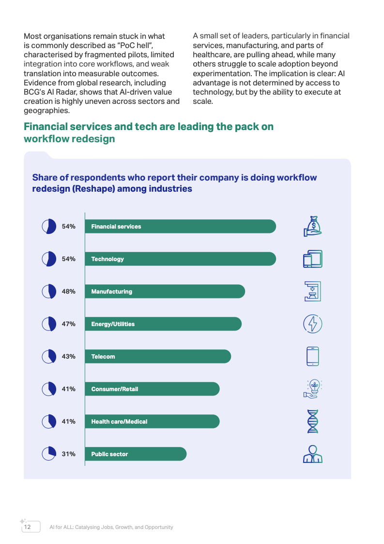 在行业落地层面,不同领域AI成熟度差异明显。金融服务、科技和制造业处于领先位置,其中约54%的金融机构已经启动工作流程重构,将AI嵌入风险评估、决策与运营体系。相比之下,农业、教育和公共医疗等高社会价值领域的AI应用仍处于早期阶段,数据基础与机构能力差异成为主要制约因素。