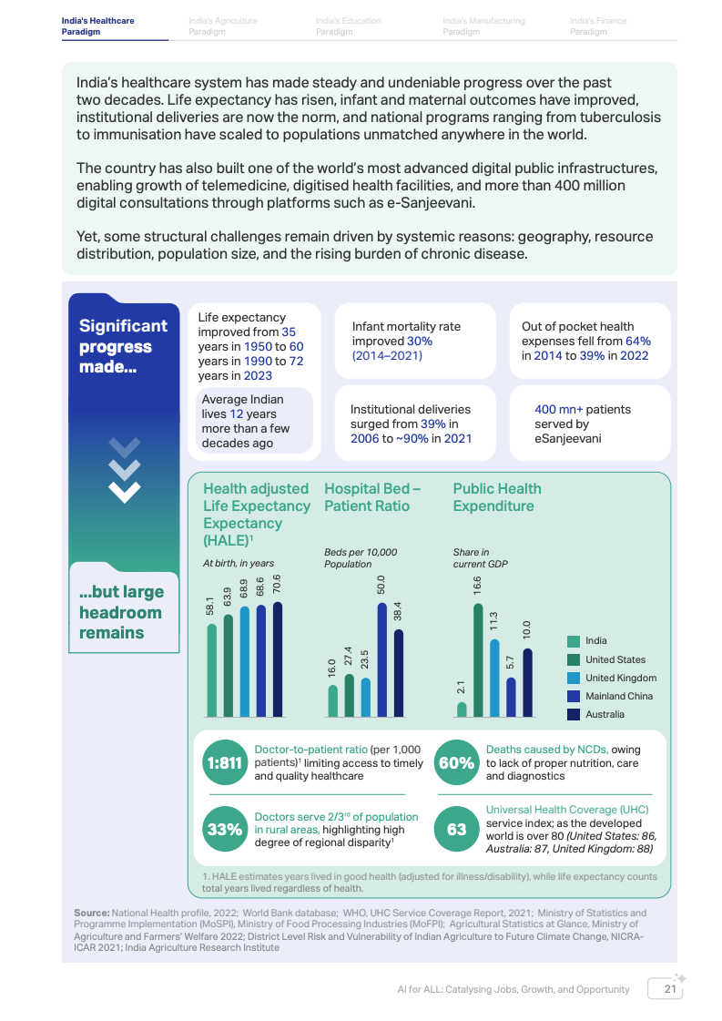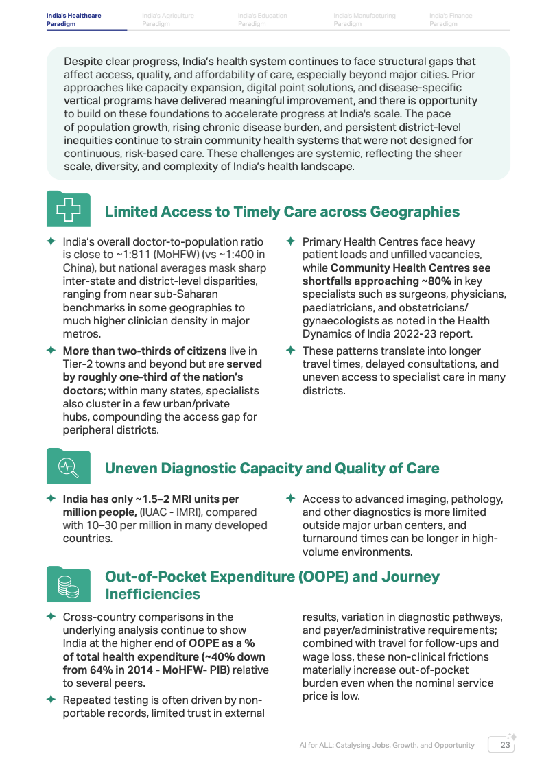 以医疗系统为例,印度医疗体系虽然取得显著进步,但结构性挑战仍然突出。医生与人口比例约为1:811,而中国约为1:400。同时,超过三分之二人口生活在中小城市和农村地区,却仅由约三分之一医生提供服务。医疗支出中个人自付比例仍约40%,较2014年的64%虽有所下降,但仍处于较高水平。