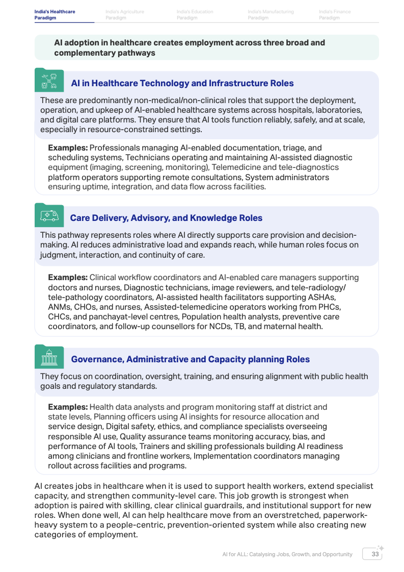 从就业视角看,AI并非简单替代劳动,而更可能重塑岗位结构。报告认为,AI将在三类领域创造新的就业机会:一是AI辅助医疗、数据分析和远程医疗等服务型岗位;二是AI设备维护、系统运维和数字医疗平台管理等技术岗位;三是数据治理、AI伦理监管和数字公共服务规划等治理岗位。