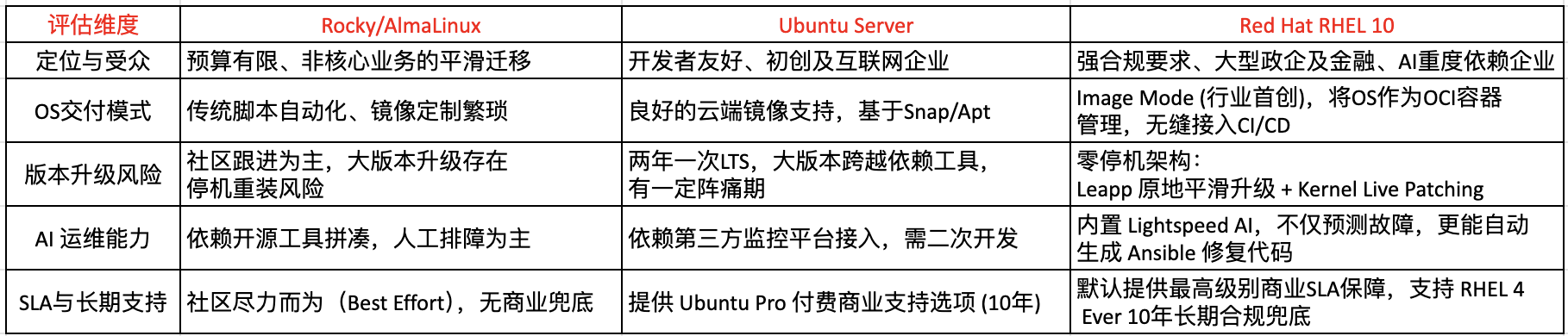 CentOS 的全面停更不仅是一个时代的结束,更迫使 CIO 和 IT 架构师们重新审视底层基础设施的价值。在 AI 模型爆发与全面容器化的今天,操作系统已经从简单的“承载工具”变成了影响业务敏捷性和安全合规的核心变量。面对市场上众多的 Linux 发行版,企业该如何抉择?本文将围绕交付效率、生命周期、智能运维与商业合规四大维度,对目前主流的三大路径——RHEL 10、Ubuntu Server、以及 Rocky Linux进行评估。
