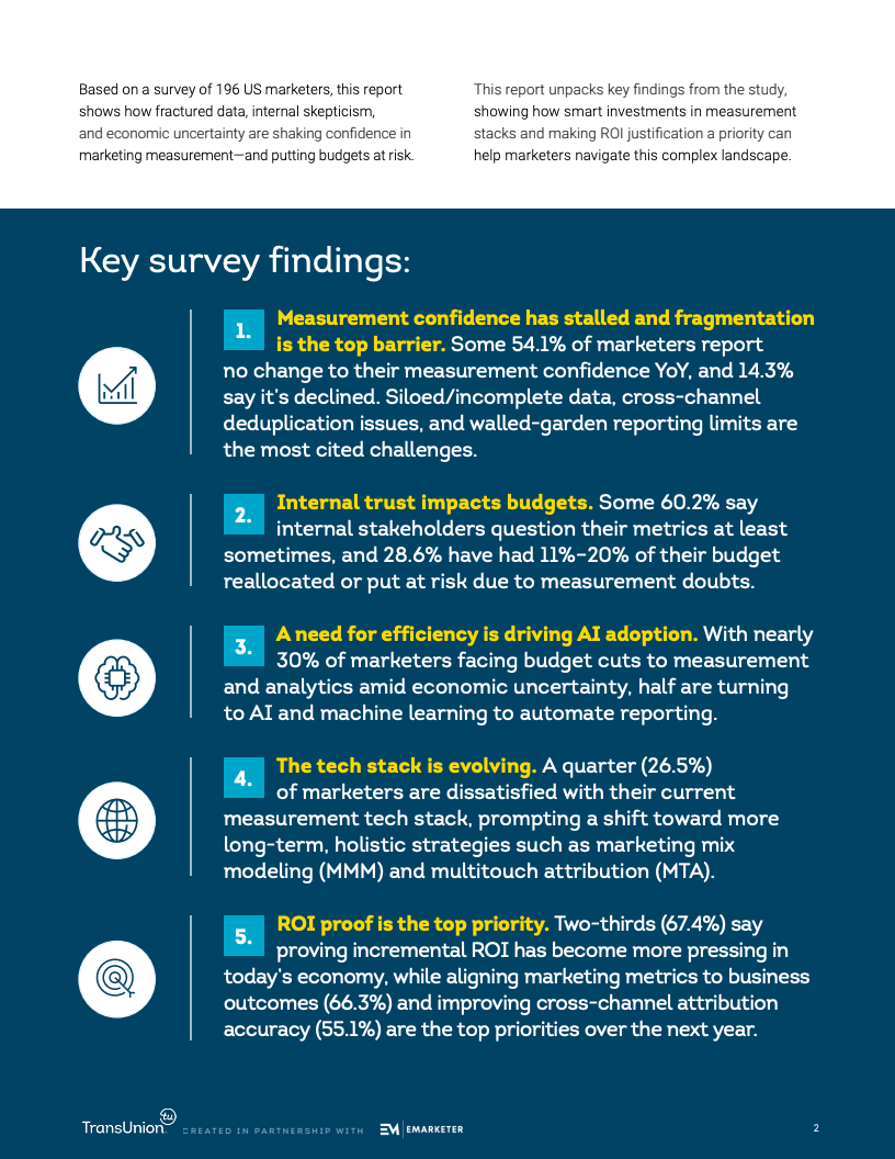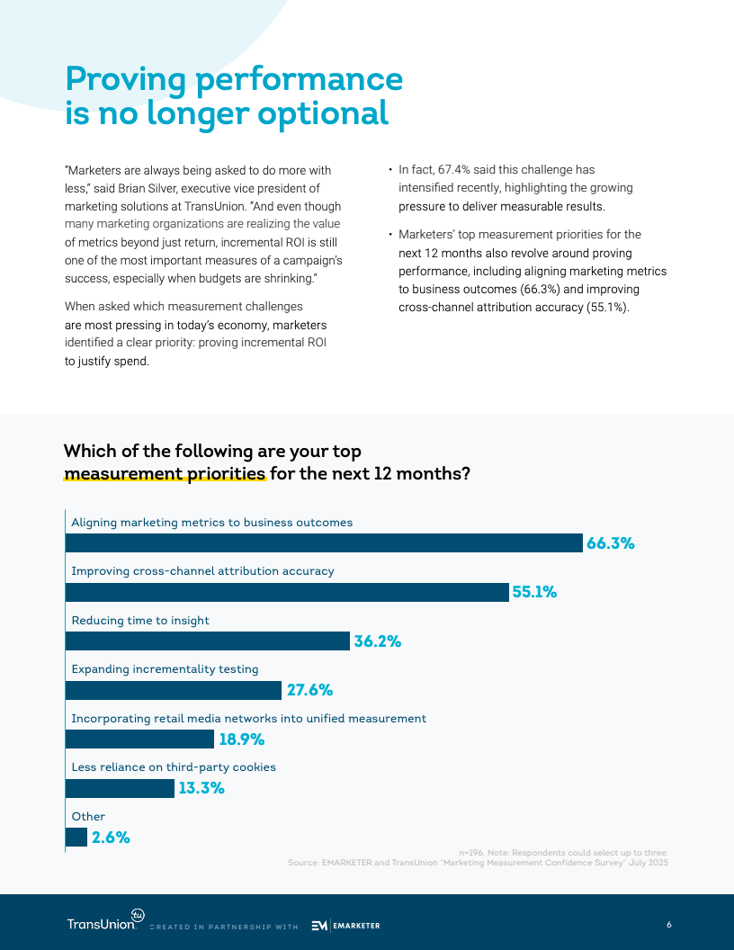 在宏观不确定性背景下,67.4%的营销人员认为证明增量ROI的压力显著上升,66.3%将指标与业务结果对齐,55.1%优先提升跨渠道归因准确性。