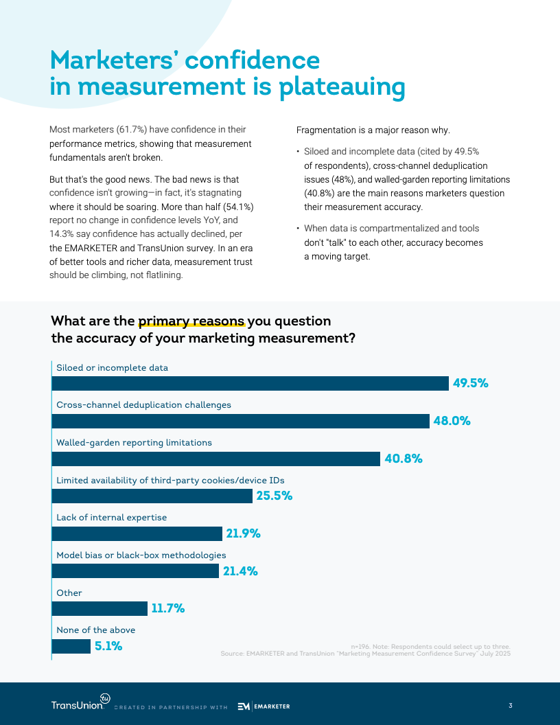 基于对196名美国营销人员的调研显示,61.7%的受访者对绩效指标仍保持信心,但54.1%认为信心同比未提升,14.3%甚至下降,表明衡量体系进入“信心平台期”。