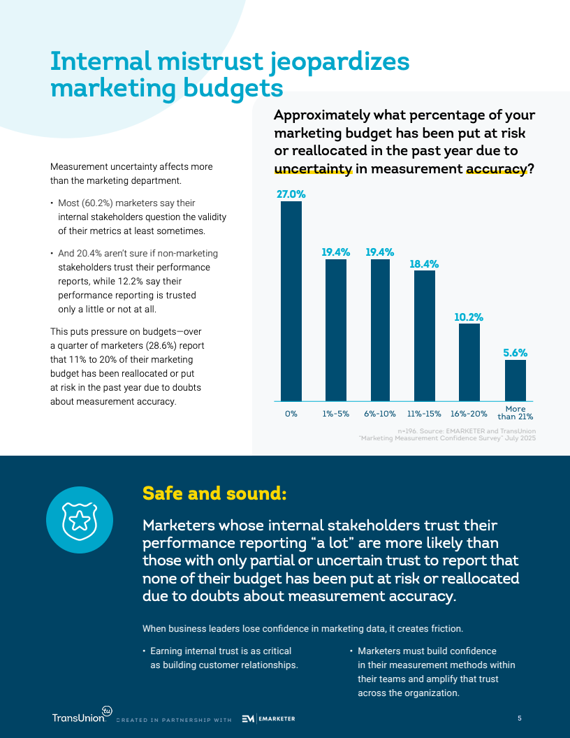 内部信任缺失正在直接转化为预算压力,60.2%的营销人员表示其指标至少偶尔被质疑,20.4%不确定是否被信任。