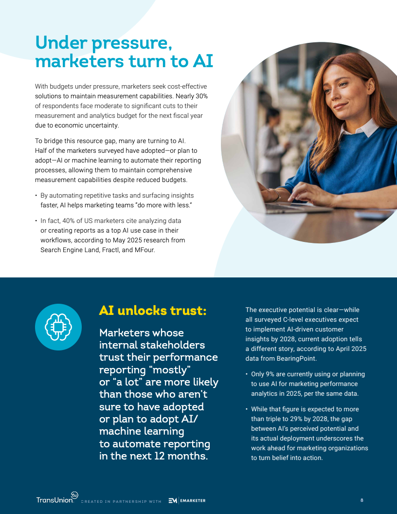 成本压力推动技术路径转型,近30%的企业面临测量预算削减,而50%的营销人员已采用或计划采用AI自动化报告流程。