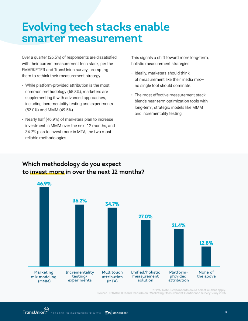 技术栈升级成为共识,26.5%的营销人员对现有体系不满,65.8%仍依赖平台归因,但52%已引入增量测试,49.5%采用MMM模型。