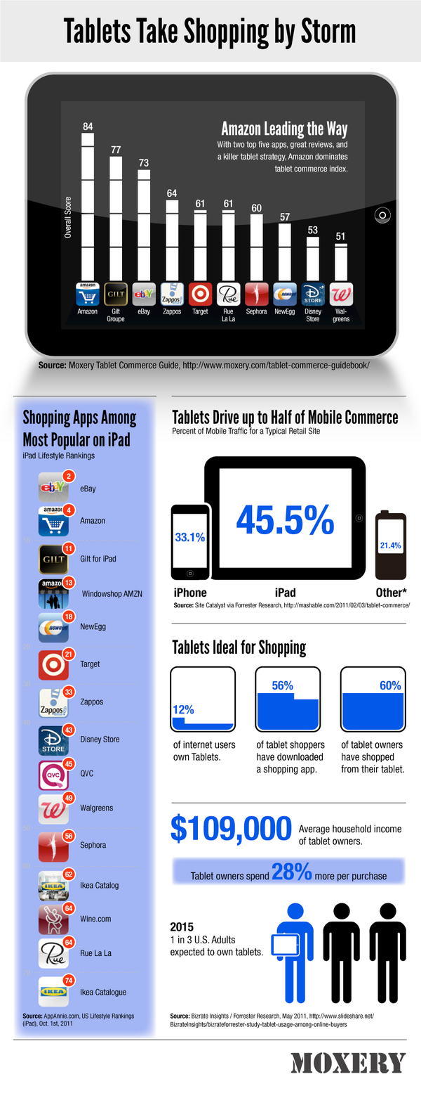 Moxery:谁能把握平板购物商机-数据信息视图 平板购物商机面前,哪家电商最具优势,答案是亚马逊 2个Top5的APP应用,强大的用户评论,外加杀手级的平板Kindle Fire,亚马逊已经构建好了平板电商系统 移动电商浏览,半壁江山属于平板:iPhone占33.1%,iPad为45.5%,其他为21.4% 12%的互联网用户拥有平板,56%下载了购物应用,60%的平板用户在上面购过物 平板用户家庭年均收入10900$ 平板电脑用户客单价比普通用户多28% 2015年,1/3的美国人会拥有平板 更多阅读:eMarketer:2014年使用移动设备购物消费者人数超1.5亿GWI商务报告:在线购物最新数据eMarketer:2015年全球平板用户将达到10亿人在线出版商协会:调查显示41%平板用户偏爱浏览器而非本地应用Businessinsider:移动购物浪潮下的平板商机RichRelevance:2012年Q1移动购物市场报告eMarketer:2011年美国移动电子商务零售规模达67亿美元Luxury Institute:奢侈品品牌APP可以撬开移动商务的大门Nielsen:移动终端令消费者在线下线上都更强大Nielsen:对比智能手机和平板电脑用户移动购物的差异化eMarketer:2014年的核心趋势:始终在线的电子商务MarketLive:2014年Q3移动商务占电子商务收入的四分之一Marketing Land:2014年Q3智能手机移动商务收益增长141%Foresee:移动电子商务用户满意度几乎与传统互联网持平eMarketer:手机对用户购物路径的影响