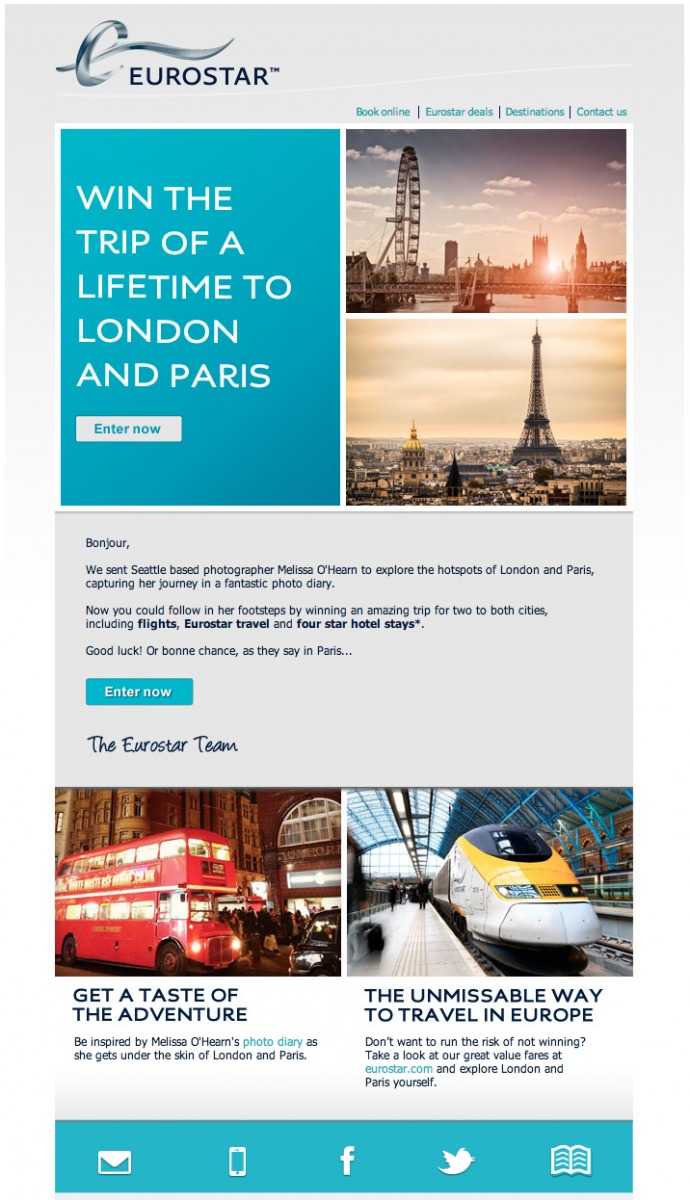 作为负责管理欧洲之星的各种服务的欧洲之星集团(Eurostar),其这封“赢取伦敦和巴黎之旅”的邮件中除了两个美丽城市的漂亮画面,还有一系列独特的CTAs,所有CTAs围绕着统一目的,分布在邮件的各个部分,这对于吸引没有耐心的用户或小心谨慎的用户采取行动都非常有利。“Bonjour(法国人白天打招呼用,类似早上好、上午号)”的问候称呼,也让用户感觉就置身于法国,这些简单的语言选择使得整个邮件比单纯的营销更有意义。非常值得类似的航