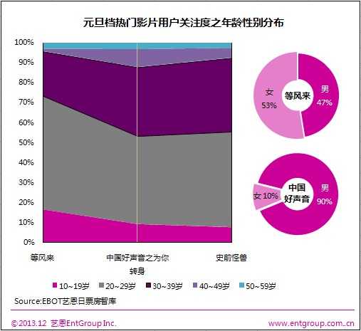 在性别分布上,《等风来》凭借爱情题材吸引了过半的女性受众,有望在一众动作片中脱颖而出;而《中国好声音之为你转身》原本冀望将电视节目的粉丝转化成电影受众,但严重失衡的男女比例显示出其营销效果并不理想。