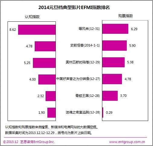 作为开年第一个假期,元旦档向来是兵家必争之地。但今年有两点变化值得注意:一是假期长度缩水至一天,二是影片量级出现较大提升。根据艺恩咨询最新发布的元旦档影片EFMI指数,《等风来》在认知指数上大幅领先,除了“滕华涛+鲍鲸鲸”组合的金牌效应外,影片连续放出多支“病毒视频”,并在社交媒体上展开密集营销攻势,基本复制了《失恋33天》的宣传轨迹,效果十分显著。而在购票指数上则呈胶着态势,合拍片《史前怪兽》凭借档期稀缺的“怪兽牌”挤进前列。同时,已于圣诞档上映的《私人订制》和《警察故事2013》也将持续挤压新上映影片的票房空间。