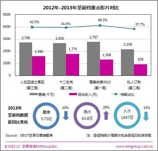 根据初步统计,今年圣诞周(12月23日至29日)总票房报收于约5.73亿元,相比去年同期滑落近十个百分点。观察过去两个圣诞档,可以发现诸多相似点:市场头牌均为“喜剧+动作”的组合,均有大腕坐镇或为热门续作,结果各自占档期的产出都超过80%。但在场次暴增三成的前提下出现票房人次双缩水的窘境,折射出档期过分依赖大片模式的先天缺陷:当影片赢得交口称赞时,市场便得以大幅扩容;而一旦市场领头羊口碑低迷,大盘也难免被拖累。
