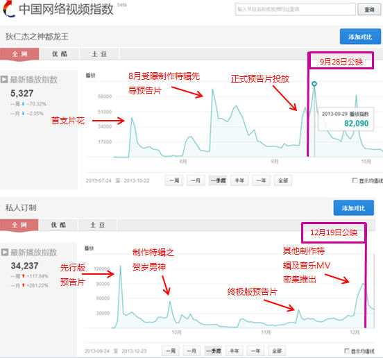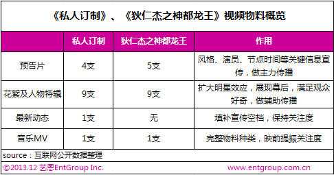 根据艺恩EBOT日票房智库统计数据,截至2013年12月29日,《私人订制》票房已达5.375亿,至此,华谊兄弟2013年度参与制作及发行的中外影片共7部,累计票房达到26.6亿。其中《私人订制》和徐克导演《狄仁杰之神都龙王》两部华谊兄弟出品的影片贡献突出,合力斩获11.36亿,占比票房总数的42.8%,作为华谊兄弟2013年度的重点影片,在宣传营销策略上不仅重视传统渠道的宣传推广,更着力挖掘社交网络和视频网站等新媒体渠道的营销潜力。