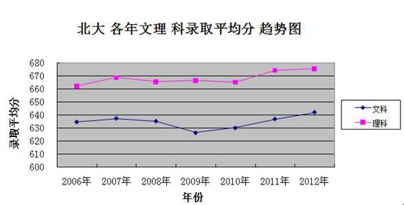 (2006-2012年9省市北大文理科录取平均分数据表,数据来源:中国教育在线)