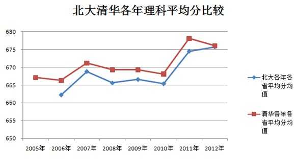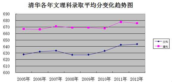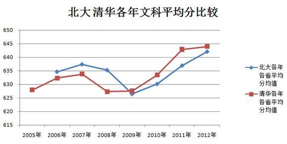 (1)北大、清华录取文科平均分均在625以上。理科录取平均分均在660分及以上。二者大体变化趋势一致。