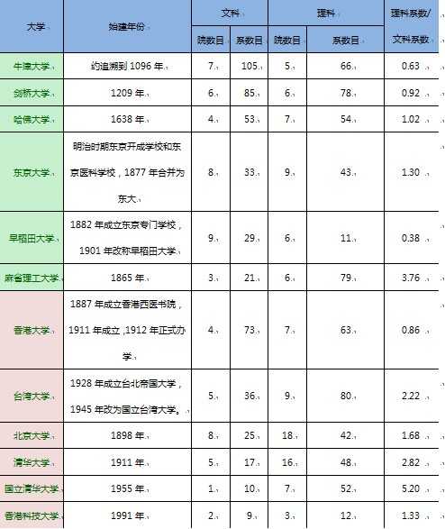 通过上表的数据对比可发现,国内大学普遍理科比重多于文科,而国外则比较平衡,除理工科类学校,文理科比例接近1:1 。(根据数据搜集,不同的大学院系设置略有差别,部分学校的院系设置中包括研究院所及一些跨学科设置。因此从院数目的上体现文理科数目对比有一定偏颇,而系数目则比较准确。)