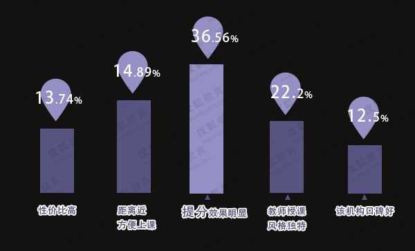 作为众多课外辅导机构“争抢”的目标人群,初高中学生及家长如何来辨别和选择课外培训机构和课程呢?通过《2013年理科基础教育白皮书调查问卷》可知,“提分效果是否明显”是学生和家长选择课外辅导班的主要因素,占36.56%,与之相对应的参加课外辅导的目的主要是“提高成绩”,占46.07%。由此可知,选择专业素质较高的课外辅导机构对提高考试成绩具有促进作用,已经被多数学生和家长广泛接受和认可。