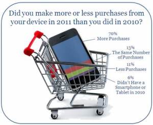 70%的用户在2011年相比2010年在智能手机或平板上购买了更多的商品;