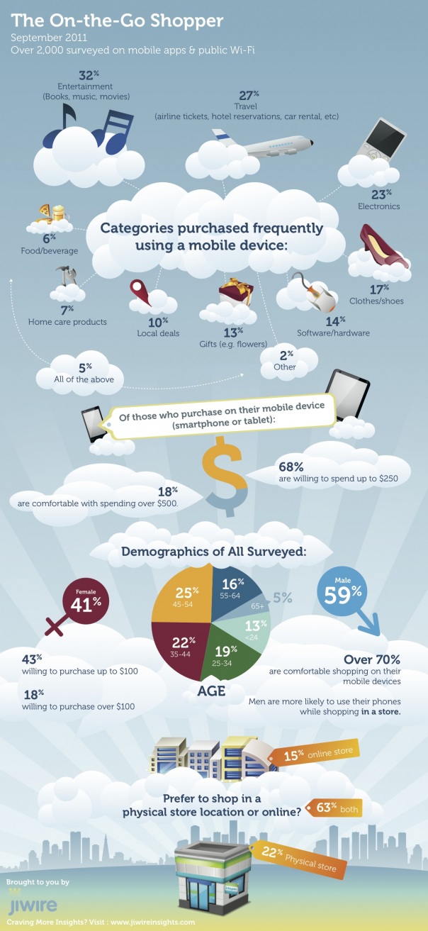 而来自Jiwire的研究发现68%的移动用户愿意在移动购物上购买高达250元的物品,18%愿意购买超过500美元以上的物品。JiWire的研究还发现70%的男性习惯在他们的设备上购物,男性也比较可能在线下店铺时使用移动设备进行购物。