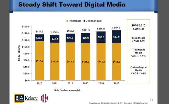 在整体本地广告份额中,数字媒体所占到的份额将从2010年的14.6%增长到2015年的25.4%。