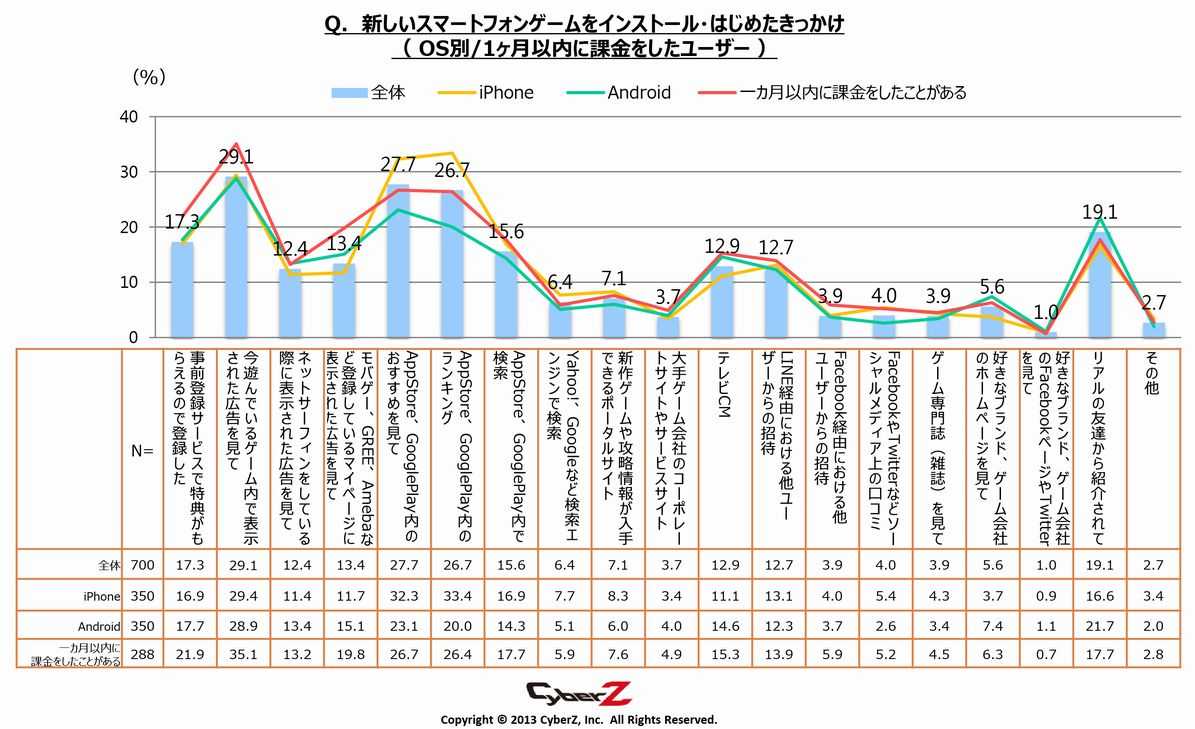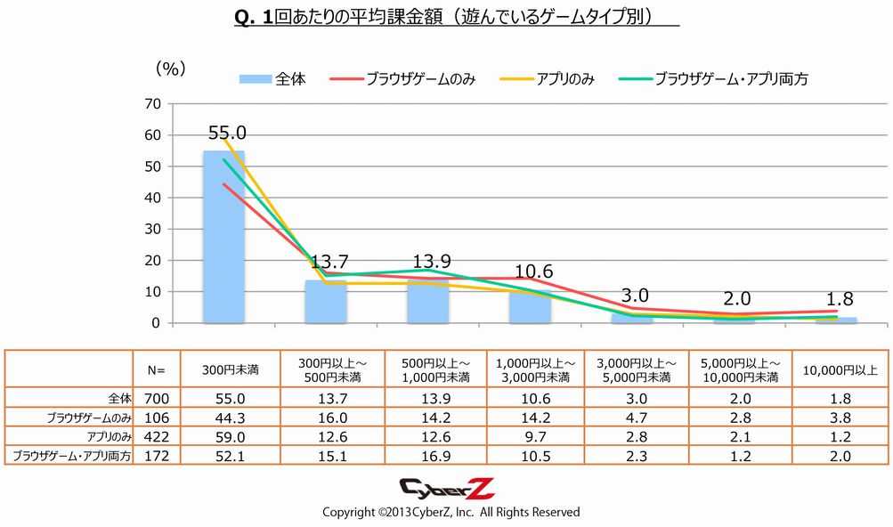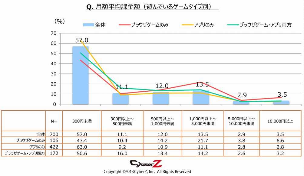 CyberZ发表的手游用户动向调查(第1回)显示,超过6成的智能手机用户只玩“app”游戏,而同时玩“app和网页游戏”的占比25%。虽然每月付费额度低于300日元(约合17.5元人民币)的用户超过半数,但和只玩网页游戏的用户相比,付费额度有明显增多的倾向。