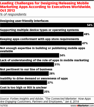想要获得移动APP的投资回报就必须进行资源投入。移动APP面对成百上千来自移动设备提供的其他干扰的竞争——经常受小屏幕的限制。大多数被访者,54%的人表示使用移动APP的最大挑战是设计用户友好界面。其次是支持多设备或运营系统(48%),保持APP与APP商店要求的一直(47%),不要设计的过于专业性强(34%),以及缺乏对APP营销角色的基本认识(31%)。