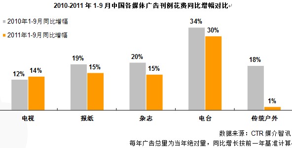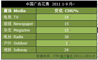 2011年11月22日据权威研究机构CTR最新发布的中国广告花费数据显示,2011年前三季度中国市场刊例广告同比增长14 %,略低于去年同期。前三季度中国GDP同比平均增幅为9.4%,GDP增速回落,我国经济正在经历一次有序放缓。同时,中国广告市场在广电新政措施(限娱令、限酒令、限医令),市场与媒体博弈下逐步迈入整合过渡期。