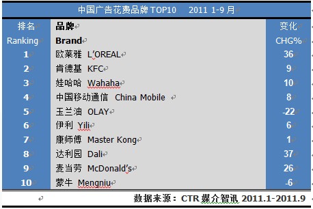 欧莱雅取代玉兰油成为广告投放NO.1,增幅达36%,是TOP10品牌中增幅第二大的品牌。达利园广告投放额跻身前十榜单,增幅37%位列前十大品牌首位。其与娃哈哈、康师傅竞争更显加剧。玉兰油和蒙牛的广告投放额均出现下滑,其中玉兰油降幅达22%。麦当劳进入前十位品牌榜单,抗衡位居第二的肯德基,世界两大快餐品牌在中国市场竞争愈加白热化。相比去年同期,碧生源和三精跌出前十,国内保健品行业在2011年投放中已显乏力之态。