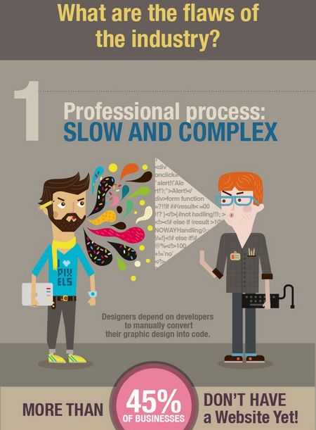 1. 专业的开发程序比较慢,而且很复杂。设计师主要是依赖于开发者将他们的图形设计通过人为方式转换成代码,这是一方面。其次就是,现在有超过45%的企业还没有自己的网站,可见Web开发还是存在一些困难的。